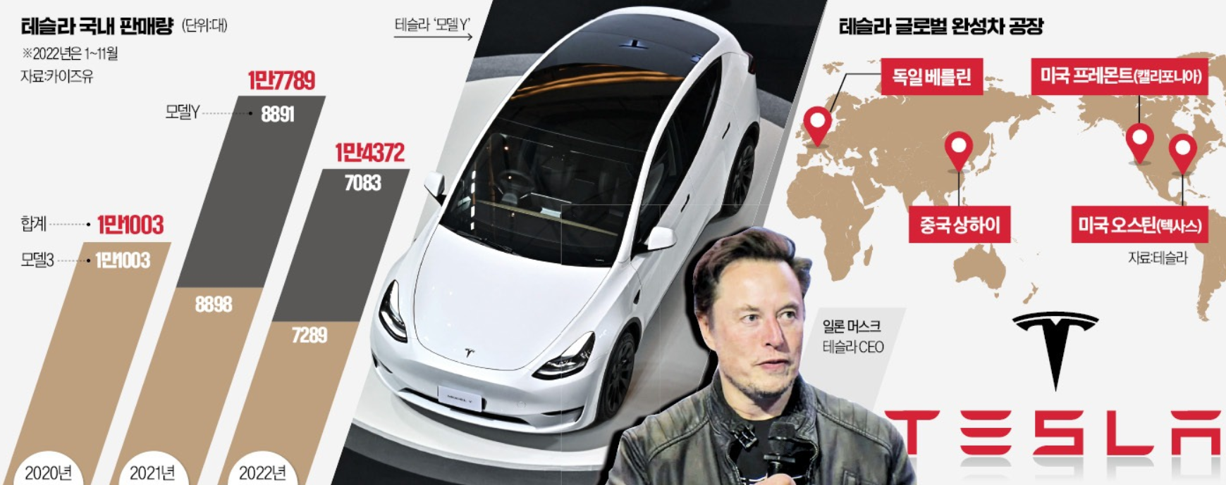 한국의 테슬라 판매량은 2020년에 1만대를 돌파한 이후, 2021년 17,789대를 판매하였으며, 2022년에는 공급문제로 인해, 14,372대를 판매중에 있습니다.