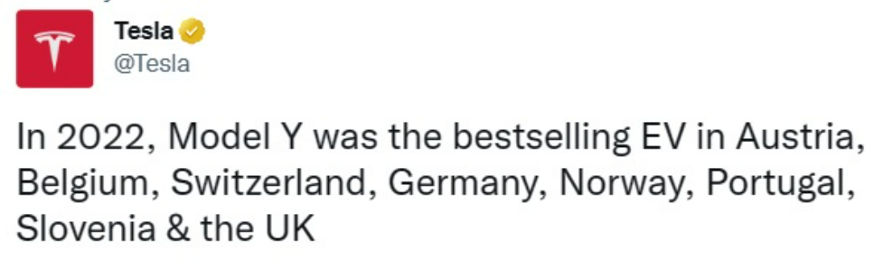 테슬라의 모델Y는 미국과 중국 이외에도 유럽의 오스트리아, 벨기에, 스위스, 독일, 노르웨이, 포르투갈, 슬로베니아, 영국 등에서 2022년도 베스트 셀링 차량으로 뽑혔습니다.