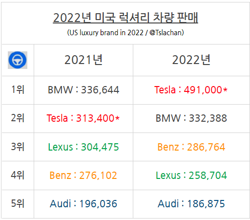 2021년 BMW에 이어 아쉽게 2위에 그쳤던 미국 럭셔리 브랜드 차량 판매대수에서, 2022년도에는 테슬라가 압도적인 차이로 1위에 오르게 되었습니다. 미국 자동차 회사로서는 25년 만의 기록이며, 테슬라의 미국 판매는 전년대비 무려 56%나 성장한 기록입니다.
