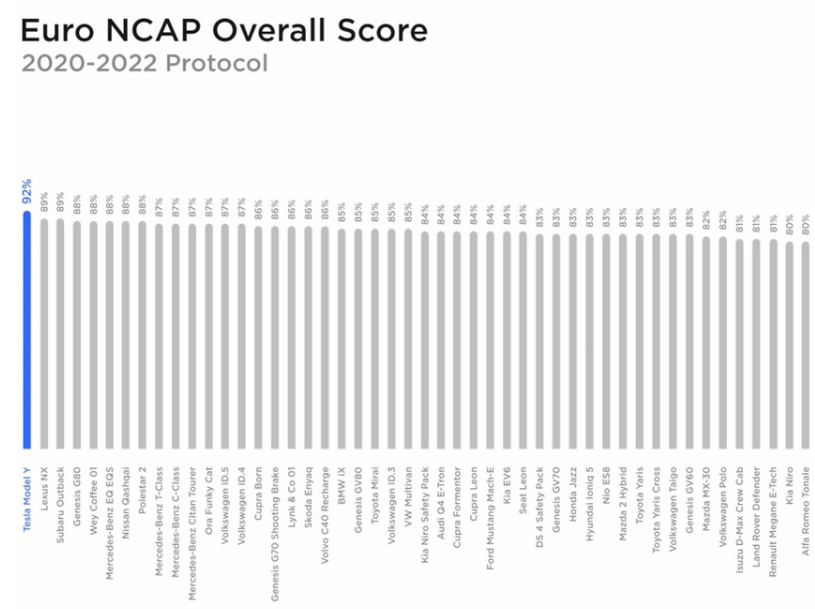 테슬라의 모델Y는모델 Y는 2022년도 Euro NCAP에서 테스트한 모든 차량 중 가장 높은 안정성 점수를 받았습니다. 테슬라 모델 Y는 92%의 안정성 점수를 받아, 렉서스와 수바로 등의 일본 차량보다 훨씬 안전한 차량의 점수를 받았습니다.