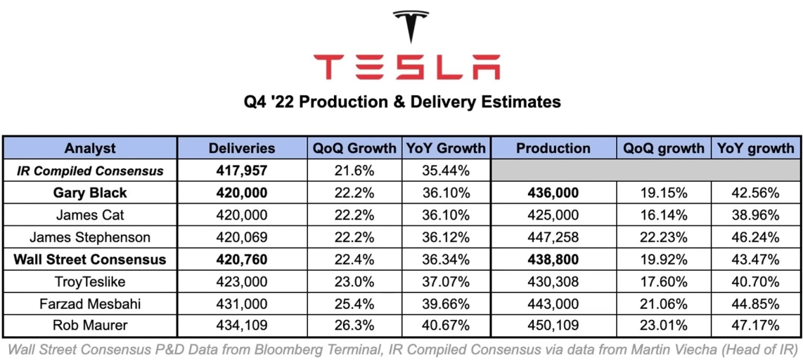 테슬라의 2022년도 4분기의 인도량을 월가의 애널리스트의 예상 인도량수를 정리해 놓은 표입니다.
