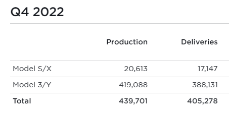 하지만, 오늘 나온 테슬라 IR자료에 따르면, 모델 S/X를 20,613대 생산하여, 17,147대를 인도하였으며, 모델 3/Y를 419,088대 생산하여, 388,131대를 인도하며, 4분기 총 439,701대를 생산하여, 405,278대를 인도하였다고 발표했습니다.