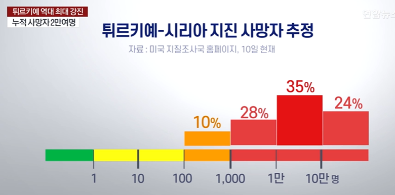 금일도 어린아이가 구조되는 진기한 광경이 나오고 있으나, 구조의 골든타임이 서서히 지나가면서 기적의 생환 소식도 빈도가 줄어들고 있는 추세입니다. 또한, 현재가 한 겨울이기 때문에 영하권의 날씨와 악천후로 인해 구조에도 난항을 겪고 있다고 알려졌으며, 튀르키예 소방당국은 2월 6일 첫 지진 이후, 1891건의 여진이 발생했다고 밝혔습니다. 이에 따라, 미국 지질 조사국에서 밝힌 예상 사망자는 1만명에서 최대 10만명까지 발생할 확률이 35%나 되며, 10만명 이상의 사망자가 발생할 확률도 24%에 이르는 것으로 추정되었습니다.