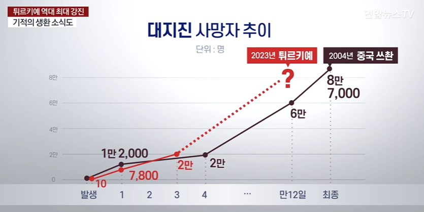2004년 중국 쓰촨성에 발생한 대지진으로 최종 87,000명의 사망자가 발생하였으며, 이번 튀르키예 사망자 추이와 비교해보면, 이번 튀르키예 지진으로 인한 사망자가 지진 발생 3일 후, 중국 쓰촨성 지진때의 사망자보다 더 많은 것으로 보아, 튀르키예 대지진으로 발생할 사망자수는 약 10만명에 이를 것으로 예측하고 있습니다.