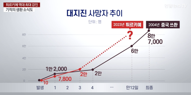현재 튀르키예 지진으로 밝혀진 사망자만 해도 벌써, 4만여명에 이르고 있으며, 2004년 중국 쓰촨성에서 발생산 지진의 예를 보면, 지진 발생 후 3일이 지난 시점에서 튀르키예 지진 사망자 숫자가 더 크다는 것을 보았을 때, 튀르키예 지진 사망자는 10만명에 육박할 것으로 보입니다.