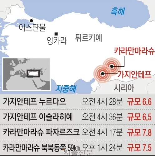 튀르키예에서 1939년 에르진잔 지진이후, 가장 큰 재난이 발생하였으며, 규모가 무려 7.8까지 치솟는 강진을 비롯하여 규모 6이 넘는 지진이 4차례 그리고, 여진이 70회 이상 이어졌다고 밝혔습니다. 이 날 지진으로 인해, 튀르키예뿐만 아니라 시리아, 레바논, 그리스, 요르단, 이라크, 이집트까지 영향이 미쳤으며, 이탈리아 해안에는 쓰나미 경보가 발령되었습니다. 이 지역에는 시리아 내전으로 인한 난민들이 많이 살고 있는 지역으로, 텐트나 임시 건물에서 생활 중인 사람들이 많은 터라 사상자는 매우 커지고 있습니다.