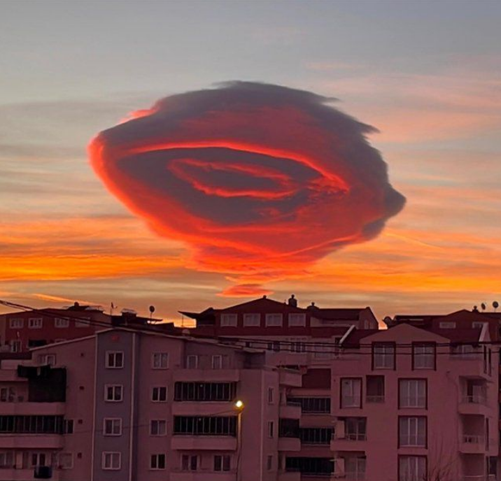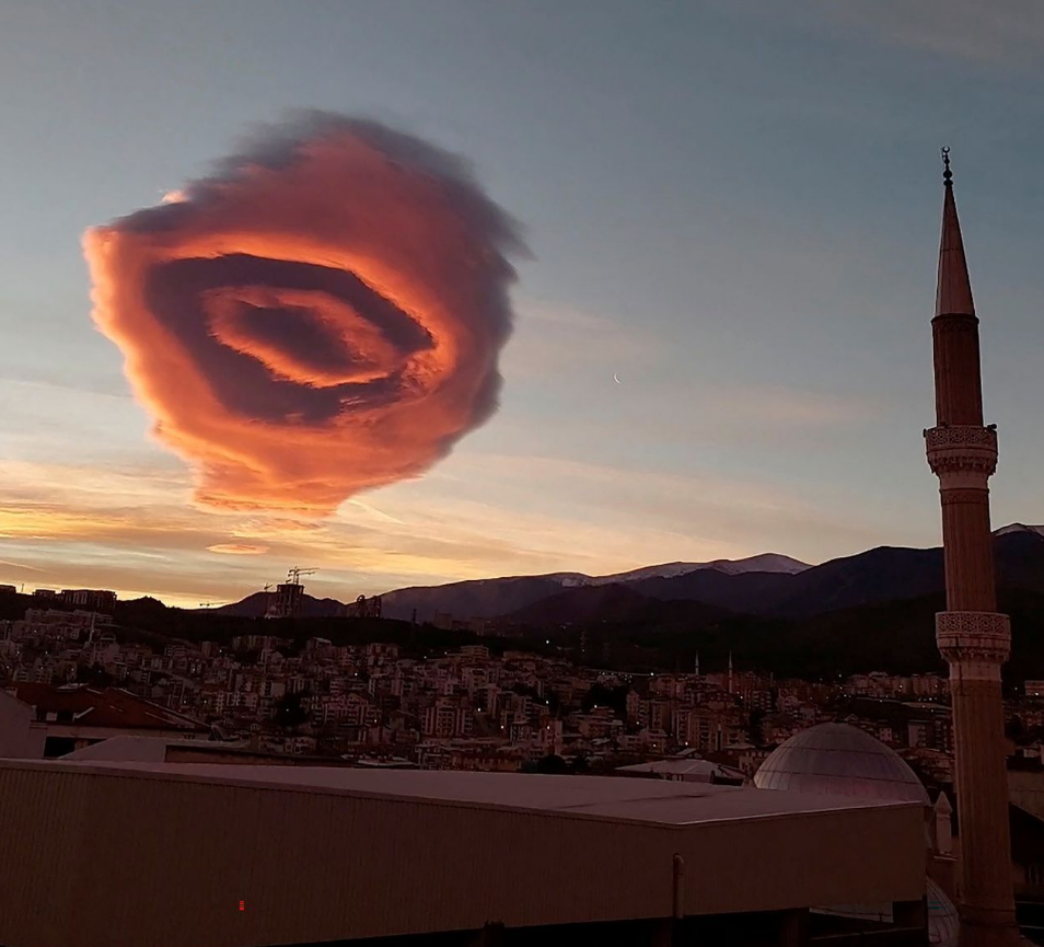 튀르키예(옛 터키) 북서부 부르사의 하늘에서 1월 19일 이른 아침 카메라 렌즈와 같은 구름모양이 나타나 화재가 되고 있습니다. 꼭 블랙홀처럼 생긴 구름모양의 정체가 무엇인지 매우 궁금해지며, 꼭 UFO처럼 생긴 모양의 구름은 1시간 이후 사라졌다고 합니다.