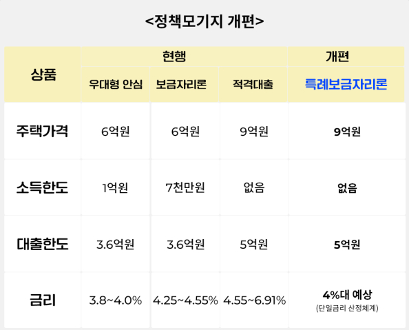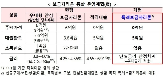 기존 보금자리론은 부부 합산 소득 연 7천만원까지만 이용할 수 있었으며, 주택가격도 6억원으로 한정되었지만, 이번에 출시할 특례보금자리론은 소득제한을 완전히 풀었으며, 주택가격도 9억원으로 상향하였습니다. 또한, 대출한도도 최대 5억원까지로 정했습니다. 또한, 현재 1억원 초과 대출자에게는 DSR 40% 규제가 적용되지만, 이번 특례보금자리론에는 이런 제한도 모두 폐지되었습니다.