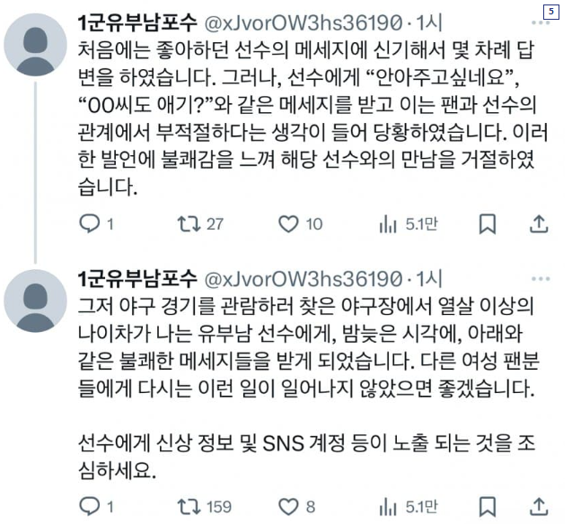 한화 이글스의 한 여성팬은 1군 유부남 포수에게 메시지를 받고 나서, 짧은 대화를 해 나갔는데, 10살 이상 차이가 나는 유부남에 자녀도 있는 선수에게 '안아주고 싶다', 귀여우시고 예쁜데, 내 눈에만 그런가?' 등 성적 발언을 듣고, 부적절한 느낌이 들어, 유부남 포수와 대화를 중단하고, 이 메시지를 공개하기로 결정했다고 합니다.