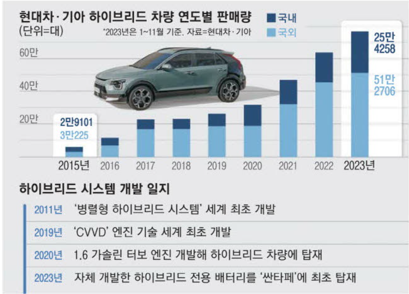 현재, 하이브리드 자동차 Top 3 로는 더 뉴 그랜저 IG, 쏘렌토 MQ4 하이브리드, 디 올 뉴 기아 니로가 인기리에 판매되고 있으며, 트렌디한 디자인과 높은 연비, 친환경성 등이 합리적인 소비를 추구하는 2030 세대 젊은 고객들의 취향을 사로잡아 높은 인기를 끌고 있습니다.