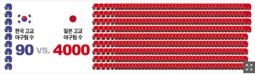 일본은 인구 1억 2천만명에 고등학교 야구부가 무려 3,857개나 있으며, 한국은 인구 5천만 명에 고등학교 야구부가 단 96개밖에 없습니다. 무려 일본이 40배나 많은 야구부를 보유하고 있습니다. 일본의 스포츠계에서 야구는 진심이며, 야구는 모든 고등학교에 대부분 포진되어 있습니다. 이렇듯, 유소년들이 야구를 대부분 취미로 하고 있다는 뜻이겠죠.
