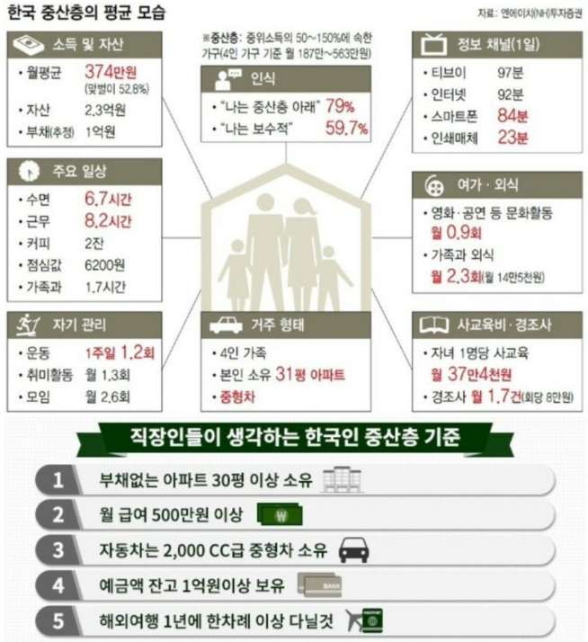 한국에서 중산층으로 사는 것은 대부분의 사람들이 꿈꾸는 모습일 것이라 생각됩니다. 일부 상당히 높은 지위에 있는 사람들을 제외하고는 말이죠. 일반 직장인들의 경우는 한국에서 중산층으로 사는 것을 목표로 하고 있을 것입니다.