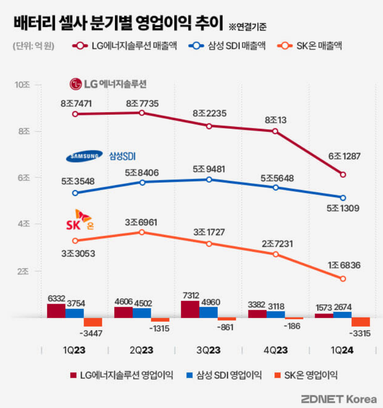 한국의 미래 먹거리 사업인 배터리 회사들의 실적이 발표되었는데요, LG엔솔, 삼성 SDI, SK온 등의 매출 및 영업이익은 점점 더 악화되고 있으며, 실적도 점점 하락하고 있습니다. 그럼, 앞으로 국내 배터리 회사들의 실적은 어떻게 될지도 알아보는 시간을 가져보겠습니다.