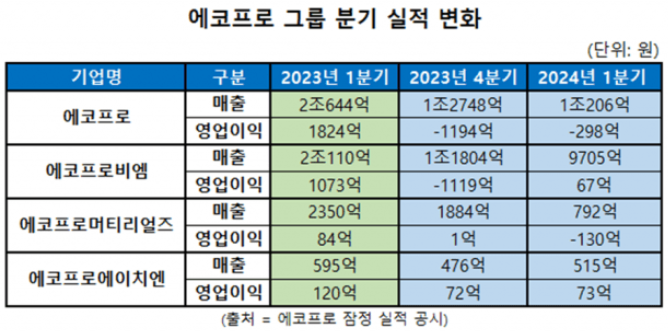그럼, 에코프로 그룹들의 실적을 보실까요? 에코프로는 전분기에 이어, 이번분기에도 적자를 이어갔으며, 매출 역시 점점 줄어들고 있습니다. 2023년도 1분기 에코프로의 매출은 2조 644억을 기록했으나, 2024년도 1분기 에코프로의 매출을 약 50%가 줄어든 1조 206억을 기록했습니다. 에코프로비엠과 에코프로머티리얼즈의 실적 또한 반토막이 났으며, 에코프로그룹의 영업이익도 전분기에 이은 적자를 기록하고 있습니다.