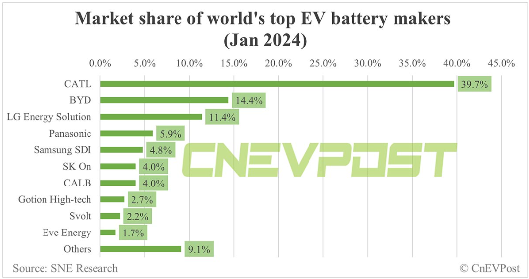 CATL은 2023년 1분기에 시장점율 33.9%를 차지했으나, 1년이 지난 2024년도 1분기 현재는 39.7%로 약 6% 정도의 시장점유율이 늘어나면서, 독보적인 1위를 기록하고 있습니다.