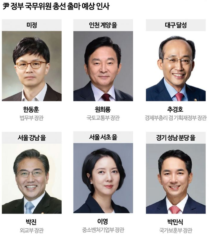 또한, 원희룡 국토부 장관의 경우, 이재명 민주당 대표 지역구인 인천 계양을 출마 가능성이 흘러나오고 있으며, 추경호 부총리 겸 기획재정부 장관, 박민식 국가보훈부 장관의 출마도 확실하며, 비례대표인 이영 중소벤처기업부 장관도 출마를 준비중인 것으로 알려졌으며, 박진 외교부 장관도 총선 출마를 고민중에 있습니다.