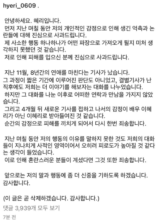 혜리는 자신의 인스타그램에 글을 올리며, '지난 며칠동안 저의 개인적인 감정으로 생긴 억측과 논란들에 대해 진심으로 사과드린다고' 게재를 했습니다. 혜리는 자신의 사소한 행동 하나하나가 어떤 파장으로 가져오게 될지 미처 생각하지 못했다면서, 저로 인해 피해를 입으신 분께 진심으로 사과드린다고 말했습니다. 또한, 혜리는 며칠 동안 저의 행동의 이유를 말하지 못한 것도 저희의 대화들이 지나치게 사적인 영역이어서, 피로도가 높아질 것 같다는 생각이 들었다며, 이로 인해 혼란스러운 분들이 계셨다면 그것 또한 죄송하다며 재차 사과를 했습니다.