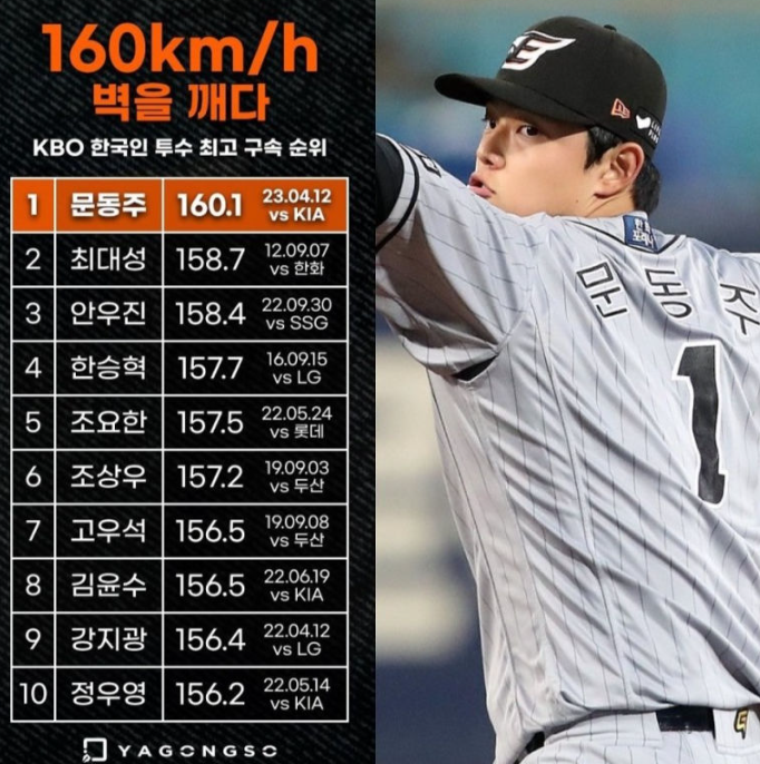 또한, 어제 안우진 선수는 문동주의 강속구를 의식했는지 두산전에서 159.8km를 찍으며 160km에 다가서면서, 한국에서도 160km 이상을 던지는 투수가 2명이나 생기게 되었습니다.