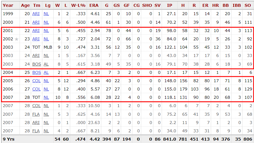 2001년 중간계투로 나오는 보직을 맡으며 무려 78경기에 등판하며, 98이닝을 던지며 엄청난 기록을 세우게 됩니다. 당시 뉴욕양키스의 전설적인 마무리투수인 마이아노 리베라가 50세이브를 올리며, 세이브왕을 차지하게 되었는데, 당시 마리아노 리베라는 최전성기였으며, 당시 71경기에 등판하며, 80이닝을 던졌습니다. 마이아노 리베라도 2001년 80이닝을 던진 것이 본인 커리어에서 가장 많은 이닝을 던진 것이었죠.