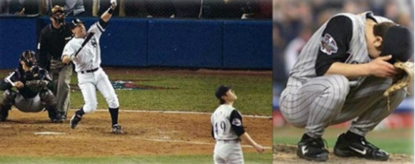 그 당시 22세의 젊은 김병현은 애리조나 다이아몬드백스의 정규시즌 우승을 이끌었으며, 플레이오프에서도 6.1이닝동안 무실점을 기록하며, 월드시리즈에 진출합니다. 월드시리즈에서 뉴욕 양키스를 만난 애리조나는 1차전 커트실링의 7이닝 1 실점으로 대승, 그리고, 2차전 랜디 존슨의 완봉승으로 출전할 기회를 놓쳤으며, 3차전은 팀패배로 3차전까지 출전 기회를 갖지 못했습니다. 드디어 4차전 커트실링의 7이닝 1 실점으로 3대 1로 이기고 있는 가운데, 8회에 등판하게 됩니다. 8회 3 타자를 모두 삼진아웃시킨 김병현은 최상의 컨디션으로 9회에도 나왔으며, 9회 투아웃 1루 상황에서 4번 타자 티노 마르티네스에게 동점홈런을 맞게 됩니다. 그 후, 다시 삼진으로 9회를 마무리한 김병현은 10회에도 출전을 강행하게 됩니다.
