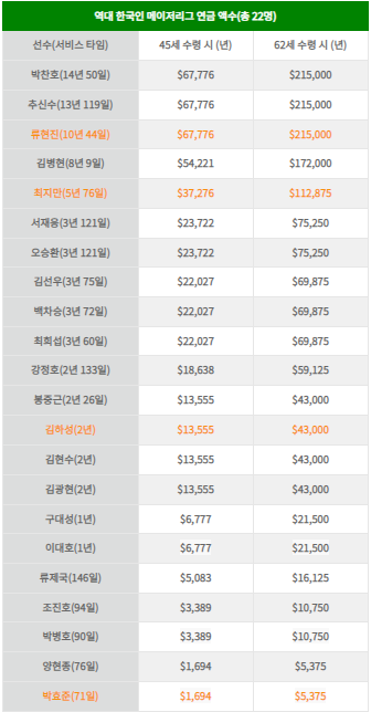 메이저리그의 연금제도는 선수, 코칭 스탭, 트레이너 모두 경력이 10년 이상되면 연금 최대치 수령이 가능하다고 하며, 62세가 되면 수령을 신청할 수 있으며, 빨리 받기를 원하면 45살에도 신청할 수 있다고 합니다. 박찬호, 추신수, 류현진 모두 메이저리그 10년 이상이 되어 연금 최대치인 $215,000(약 2.7억원) 받게 됩니다. 또한, 온 가족의 의료보험이 제공되며, 모든 가족에게 모든 질병에 따른 진료비가 100% 지원된다고 합니다.