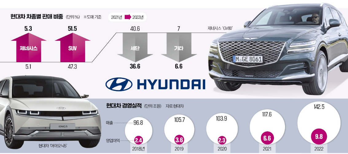 현대차가 2022년 매출과 영업이익과 영업이익률에서 역대 최대 실적을 발표하였습니다. 2022년 전체 매출은 142조 원을 기록(전년대비 21.2% 증가)했으며, 영업이익도 9.8조 원을 기록(전년대비 47% 증가) 했으며 하며 영업이익률 6.9%의 실적을 냈으며, 2023년에도 대외적 불확실성이 존재하는 상황에서도 차량용 반도체 수급 개선으로 인해, 글로벌 판매량이 전년대비 10% 정도 상승할 것으로 예측되고 있습니다.