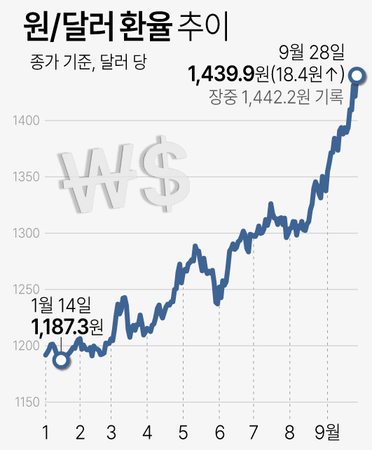9개월 만에 무려 252.6원이나 급등한 1,439.9원까지 급등하게 되었으며, 대한민국 코스피와 코스닥에 투자해 있던 미국계 자본이 엄청난 매도를 가하며, 코스피와 코스닥이 급락하게 됩니다.