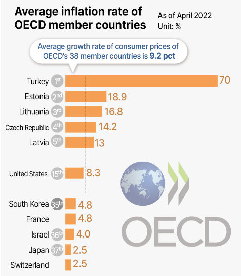 미국의 인플레이션이 8%대로 급등하게 되자, 미국 연준희는 그동안 저금리체제를 유지하던 금리를 급등시키기 시작합니다. 그래서 미국의 파월 연준의장은 0.5% 금리를 올리는 빅 스텝과 0.75%를 올리는 자이언트 스텝이라는 용어를 자주 사용하며, 매달 금리를 인상시키게 됩니다.