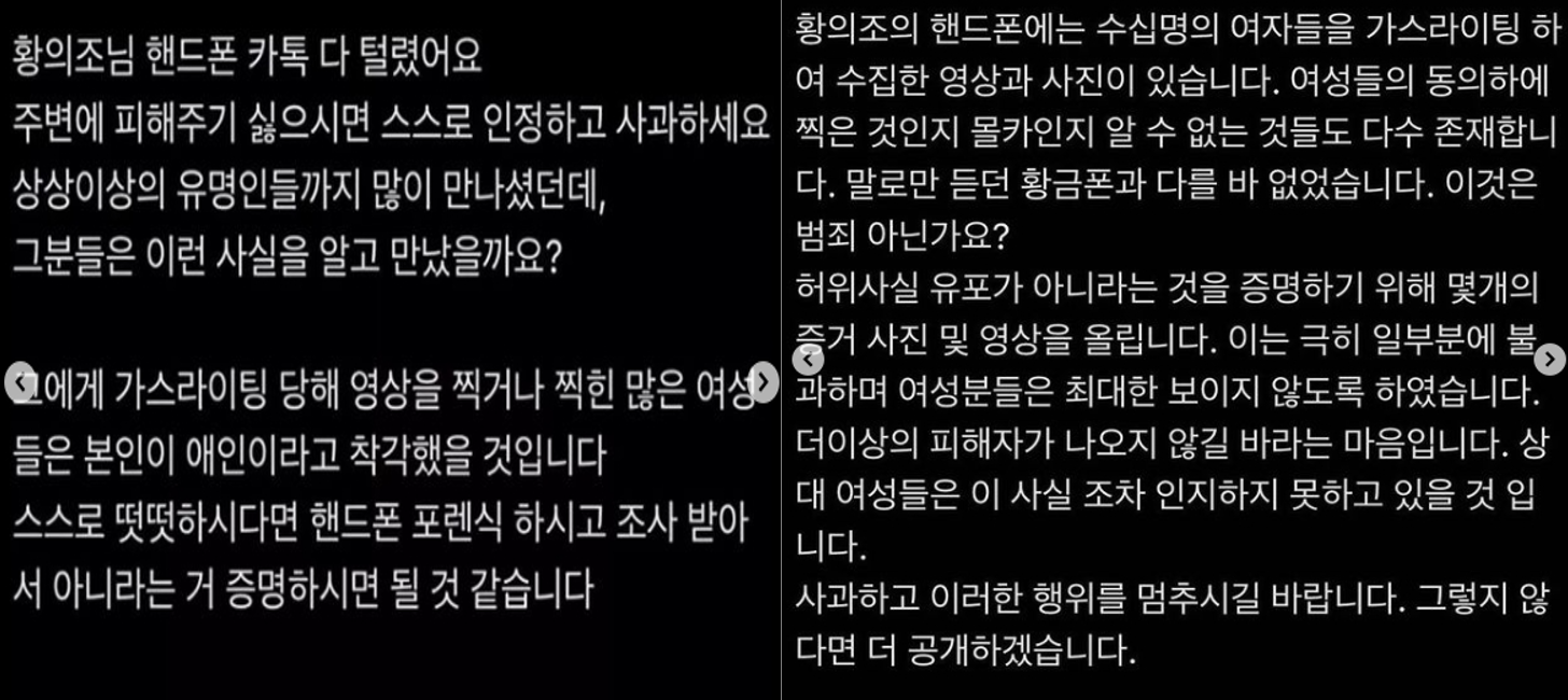 이와 같이 황의조의 사생활을 공개하는 이유는 본인과 같은 피해자가 계속 나오고 있는 상황에서 언론화를 시켜 황의조 선수의 사생활을 폭로하는 길이, 추가 피해자를 막을 수 있는 유일한 길이라고 생각했다고도 밝혔습니다. 폭로한 게시물에는 황의조선수로 추정되는 남성의 사진과 성관계 영상이 올라왔고요, 또한, 황의조 선수의 휴대전화에는 여자들을 가스라이팅해서 수집한 수많은 영상과 사진들이 있다고도 폭로했습니다. 황의조선수가 여성들의 동의를 받고 찍은 것인지 몰래 촬영한 것인지 알 수 없는 것들이 다수 있다며, 말로만 듣던 정준영의 황금폰과도 다를 바 없으며, 이건 범죄 행위가 아니냐고도 밝혔습니다.