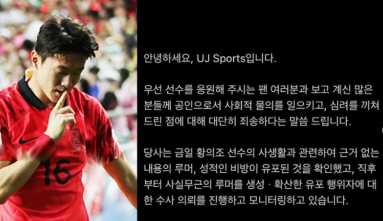 이와 관련하여 황의조는 해당 영상이 1년전 자신이 분실한 휴대전화에서 영상이 유출된 것으로 파악하였습니다. 분실된 휴대폰에서 민감한 사생활이 악의적으로 유출되어 곤혹스럽다는 입장을 펼쳤으며, 황의조 선수는 변호사 선임과 경찰 신고 등을 순차적으로 진행할 계획입니다. 황의조 선수의 매니지먼트사는 황의조 선수의 사생활과 관련하여 근거 없는 내용의 루머, 성적인 비방이 유포된 것을 확인했으며, 사실무근의 루머를 생성 및 확산한 유포 행위자에 대한 수사 의뢰를 진행하고, 모니터링하고 있다고 밝혔습니다. 현재 SNS를 통해 업로드된 내용은 모두 사실이 아니며, 불법으로 취득한 선수의 사생활을 유포하고 확산시킨 점, 이로 인해 선수의 명예를 실추시킨 점에 대해 강력하게 법적 대응할 예정이라고 밝혔습니다.