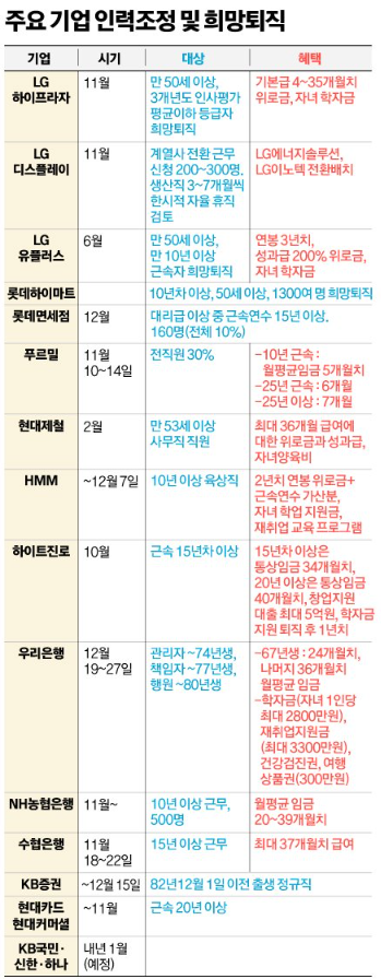 주요 대기업들은 만 50세 이상 직원들의 희망퇴직을 받고 있으며, LG하이프라자의 경우는 직원의 성과에 따라 기본급 4개월~35개월치의 위로금과 자녀학자금을 지원해 주며, LG유플러스는 연봉 3년 치와 성과급 200%와 자녀 학자금을 지원해주고 있습니다.