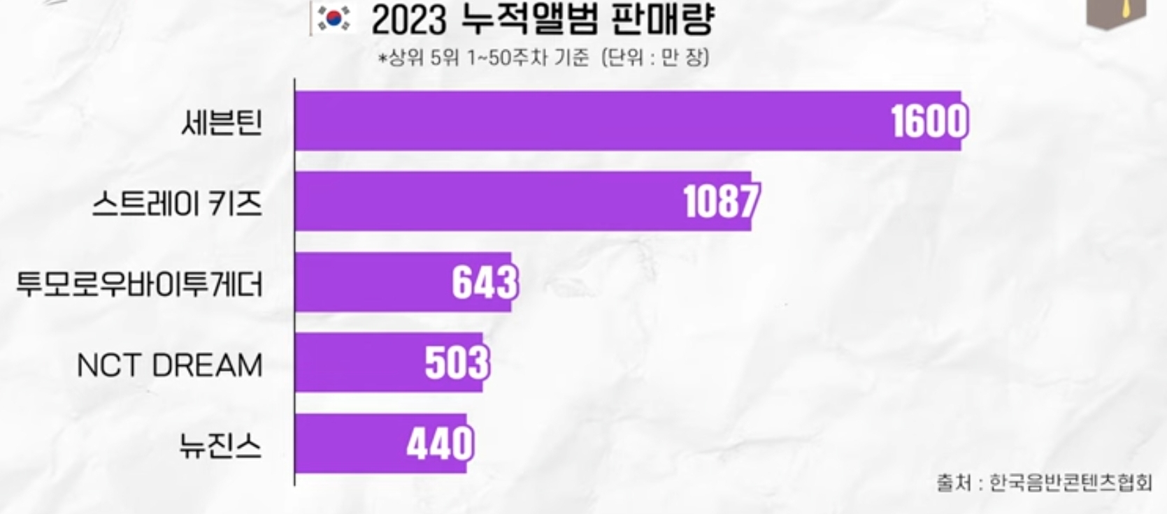 세븐틴은 2023년도 대한민국 최고 그룹이라고 해도 과언이 아닐정도로, 앨범 판매량에 있어서, 압도적인 앨범 판매량을 기록했습니다. 2023년 세븐틴은 무려 1600만 장의 앨범을 판매했으며, 2위는 스트레이 키즈로 1087만 장, 3위는 투모로우바이투게더 643만 장, 4위는 NCT의 503만 장, 5위는 뉴진스로 440만 장을 판매했습니다. 세븐틴은 다른 K팝 스타들을 압살 하는 앨범 판매량을 기록한 대한민국 최고 그룹입니다.