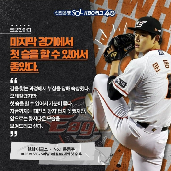 2022년 드래프트 1순위로 선발된 한화 이글스 문동주는 2022시즌 부상으로 인해 많은 경기에 나오지 못하는 등, 첫 시즌 한화 이글스에서 크게 보여준 게 없었습니다. 결국 2022 시즌 28과 2/3이닝, 평균자책점 5.65, 1승 3패를 기록하면서, 신인왕 기준인 30이닝도 넘지 못해, 2023년도 신인왕을 목표로 하고 있습니다. 그럼, 최고 158km의 강속구 투수인 한화 이글스 문동주 선수에 대해 알아보겠습니다.