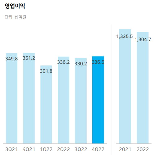 네이버의 2022년도 전체 영업이익은 1조 3047억 원으로 전년대비 1.6% 감소하였으며, 특히 4분기에 336억을 기록하며, 전년대비 14.8% 감소하였습니다.