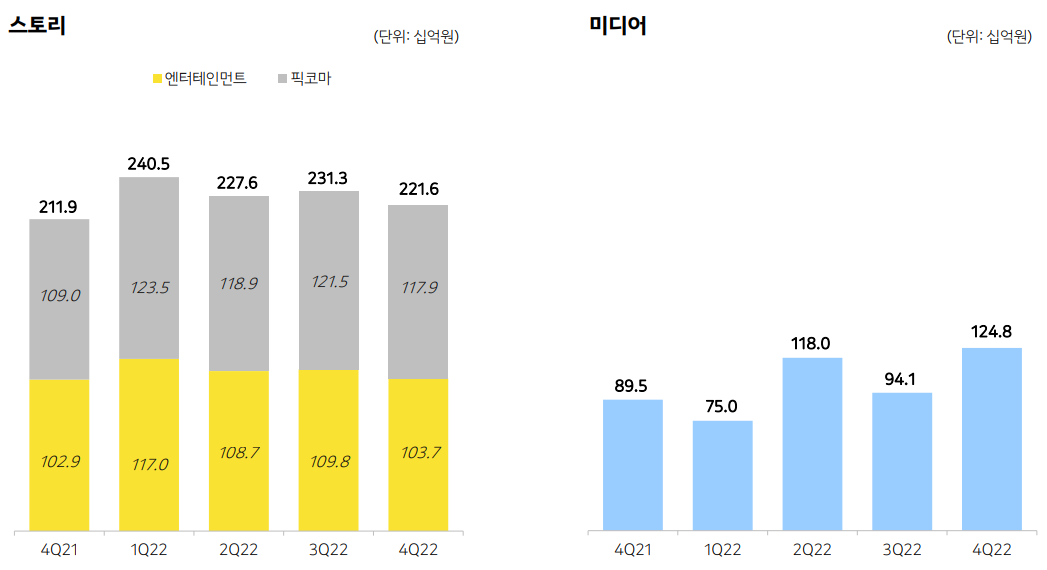 스토리의 경우는 엔터 부분에서 북미 플랫폼과 IP유통 매출 성장이 되었으며, 픽코마의 경우 일본에서의 지속 성장으로, 9,209억 원으로 전년대비 5% 증가하였으며, 카카오 미디오의 경우는 제작 작품수가 확대되어 매출 4120억 원으로, 전년대비 39% 증가하였습니다.