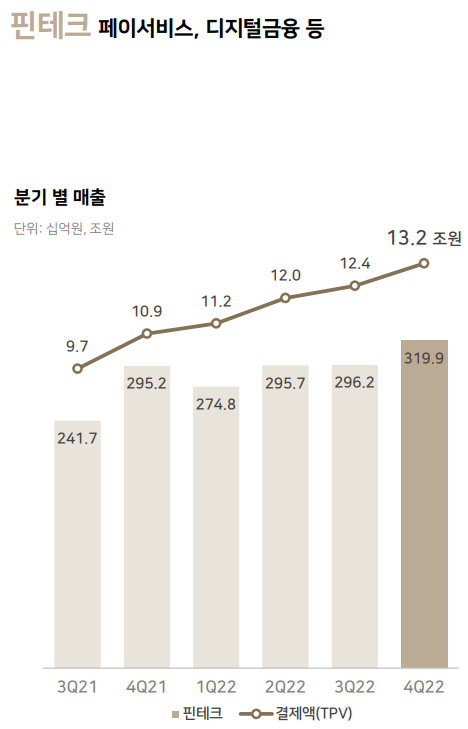 핀테크 매출액은 1조 1866억원으로 전년대비 21.2% 상승하였으며, 신규 결제처 연동 및 예약 결제 증가와 주요 현장 결제 제휴처 대상 멤버십 프로그램 혜택 확대로 오프라인 결제액이 68% 성장하였습니다.