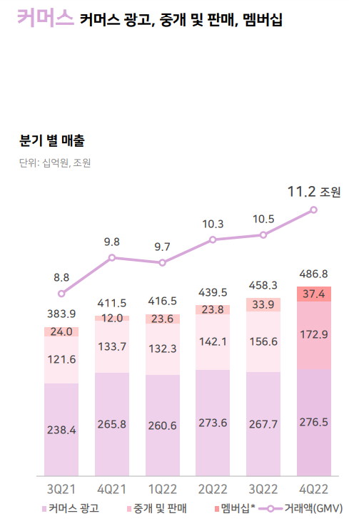 네이버 커머스(쇼핑)의 매출은 1조 8011억원으로 전년대비 21% 상승했으며, 브랜드 스토어와 여행 및 예약 서비스 등의 고성장으로 인해, 전년대비 고성장을 하였습니다. 브랜드 스토어가 전년대비 59%나 성장했으며, 여행 및 예약 합계가 전년대비 2배나 성장했으며, 멤버십 가입자수 증가로 구독료 매출액 및 멤버십 기반 거래액도 증가 중에 있습니다.