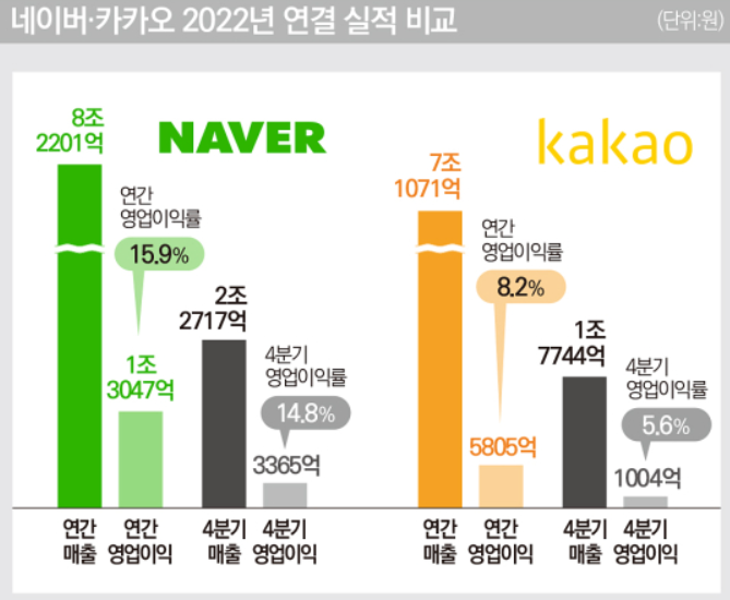 따라서, 네이버의 매출은 8조 2201억 원으로 카카오의 7조 1071억 원보다 약 15.6% 높았으며, 네이버의 영업이익은 1조 3047억 원으로 카카오의 5805억 원으로 224% 더 많았습니다. 네이버와 카카오 모두 전년대비 매출은 상승했으나, 영업이익은 소폭 감소하였습니다.