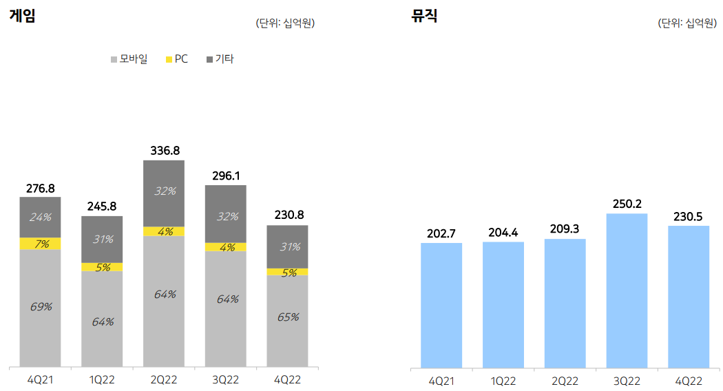 카카오게임 매출은 1조 1095억 원으로 전년대비 11% 성장하였으며, 신규 게임 출시 공백으로 인해 전년대비 17% 감소하였습니다. 카카오음악(뮤직)은 엔데믹 이후, 자사 아티스트의 활동과 공연 확대로 8,944억 원으로 전년대비 14% 증가하였습니다.