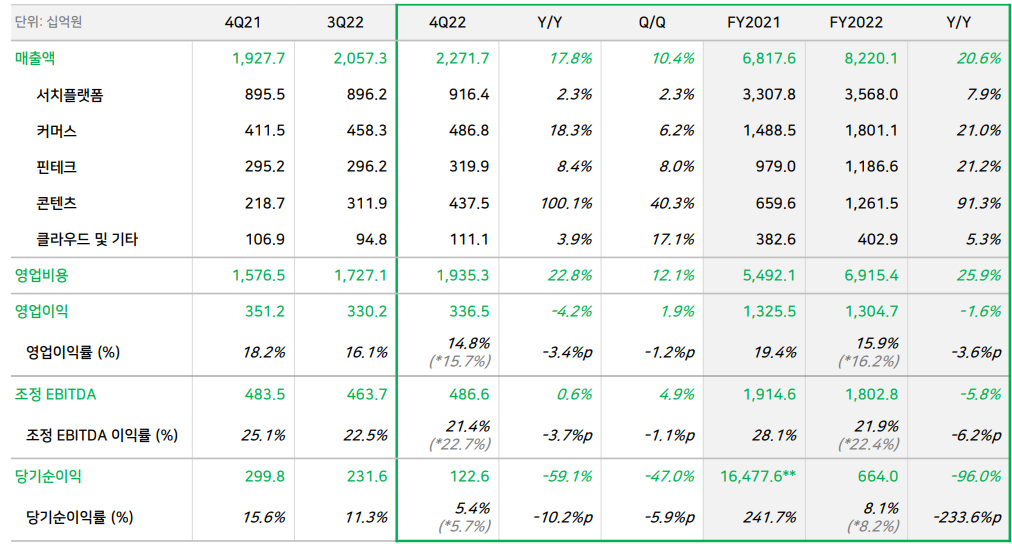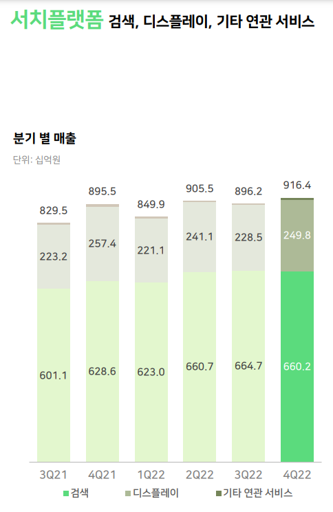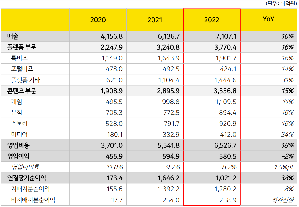 카카오톡사업(톡비즈)으로의 매출은 1조 9017억 원으로 카카오톡 채널 메시지와 선물하기 등의 견조한 성장으로, 전년대비 16% 증가하였으며, 포털비즈의 매출은 4241억 원으로 다음 포털 광고 매출이 전년대비 25% 감소하였으며, 기타 플랫폼으로 모빌리티 성장은 지속되었으나, 카카오페이 및 클라우드 매출의 감소로 1조 4446억 원으로 전년대비 13% 감소하였습니다.