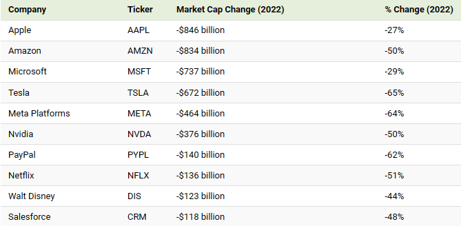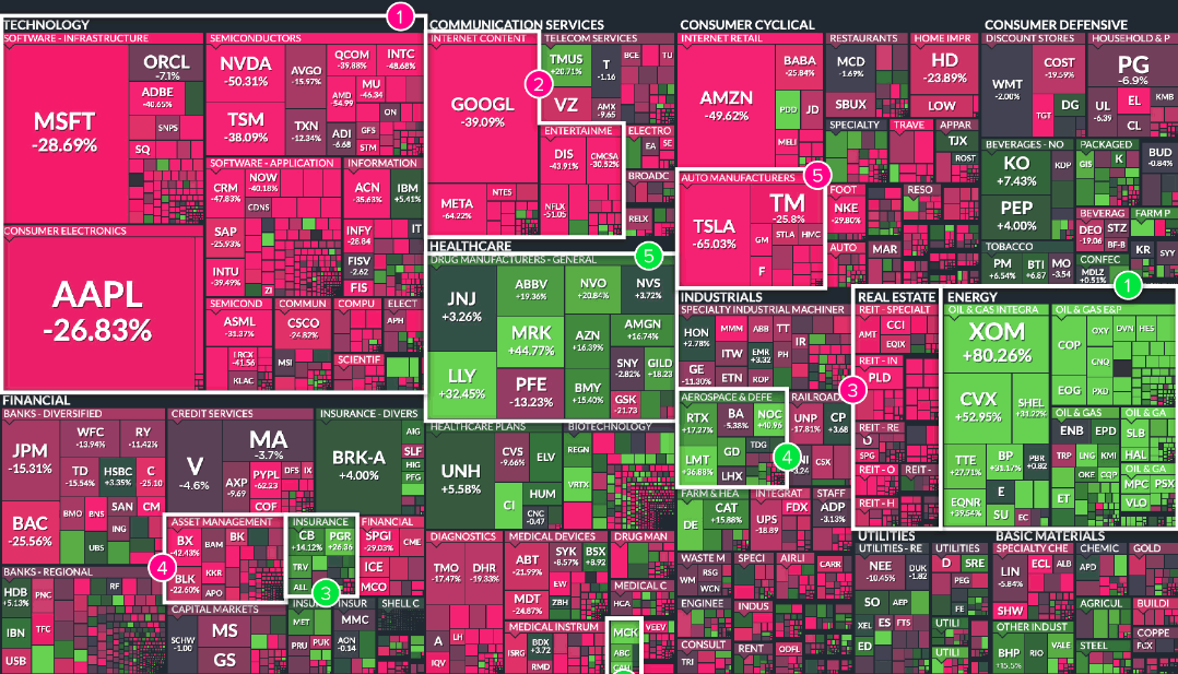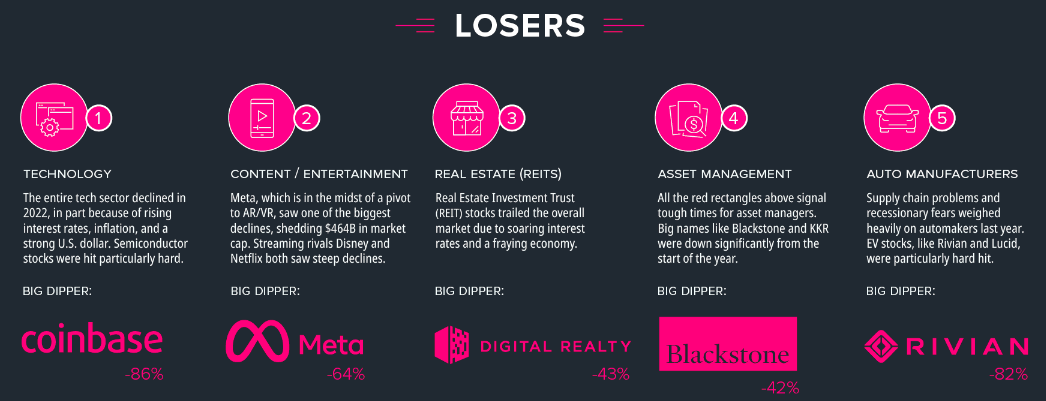 최악의 미국 주식으로는 기술주의 코인베이스가 -86%를 보였으며, 콘텐츠 주식의 메타가 -64%, 자동차 제조업 체중에서는 신규 전기차 스타트업 회사인 리비안이 -82%나 하락하는 모습을 보여주었으며, 2022년 초 시총 1조 달러 클럽에도 도달했던 시총 6위 테슬라는 -65%나 떨어지며, 시총이 18위까지 떨어지는 모습을 보였습니다.