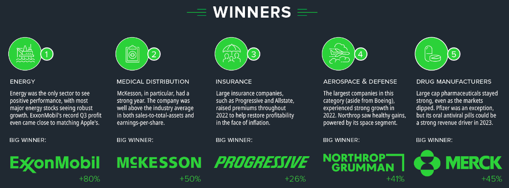 최고의 미국주식으로는 에너지 섹터의 엑손모빌이 80%나 상승하는 모습을 보였으며, 워런버핏이 2022년도에 상당히 많은 주식을 매수했던 셰브론과 옥시덴탈 페트롤리움도 약 50%나 상승하는 모습을 보였습니다. 러시아 우크라이나 전쟁을 예상하고 에너지주를 담은 워런버핏의 혜안을 엿볼 수 있었으며, 작년에는 배당성향이 높은 종목과 영업이익이 꾸준한 워런버핏이 보유하고 있는 주식들이 강점을 보인 해였습니다.