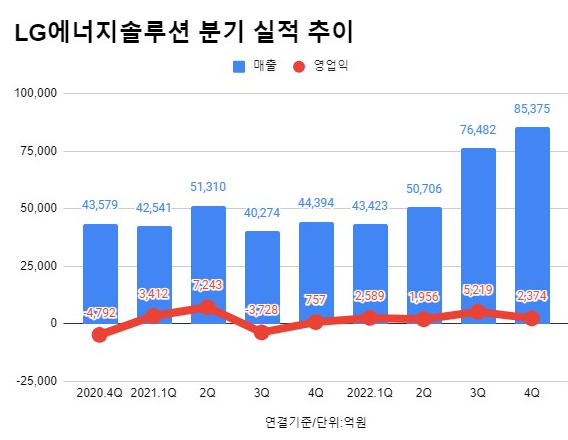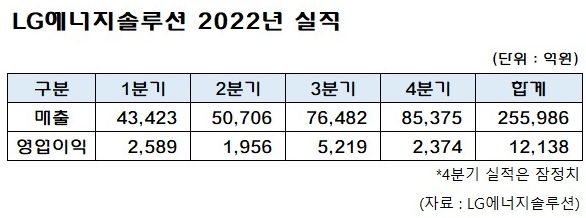 LG에너지솔루션(LG엔솔)이 2022년도 4분기 잠정 실적을 발표했습니다. 매출은 역대 최대 매출을 기록했으며, 영업이익도 전년대비 213.6% 증가한 것으로 밝혔습니다.