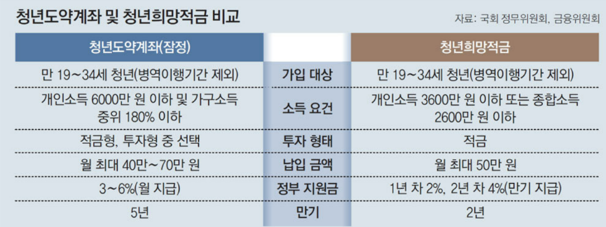청년도약계좌는 만 19세부터 34세 이하의 청년이 가입대상이 되며, 개인소득 6천만 원 이하 및 가구소득 중위 180% 이하를 가진 청년은 누구나 신청할 수 있습니다. 기존 청년희망적금이 적금형태였다면, 이번 청년도약계좌는 적금형과 투자형으로 나뉘며, 월 최대 40만 원에서 70만 원까지 납일할 수 있으며, 이자율은 3~6%까지 지급을 해주게 됩니다. 정부에서는 월 70만 원을 5년간 납입할 시, 5천만 원의 돈을 만들어낼 수 있는 장점이 있다고 합니다.