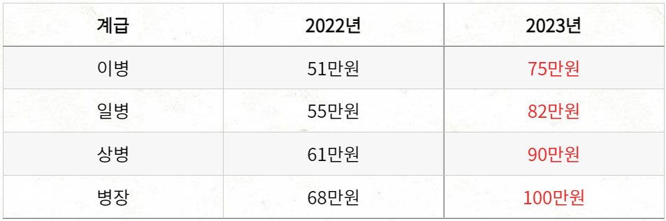 군인 월급이 2022년 대비 대폭 증가됩니다. 2023년 이등병 월급은 75만 원, 일병은 82만 원, 상병은 90만 원, 병장월급은 100만 원으로 상승하게 됩니다.