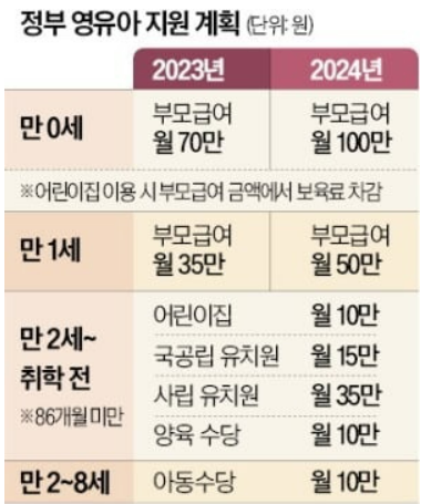 또한, 2024년에는 만 0세 유아 부모에게는 월 100만 원, 만 1세 유아를 가진 부모에게는 월 50만 원씩 지급되며, 만 2세부터 8세까지는 2024년부터 아동수당이 월 10만 원이 지급되며, 어린이집, 국공립유치원, 사립유치원 등 월 10만 원에서 35만 원까지 지급됩니다.