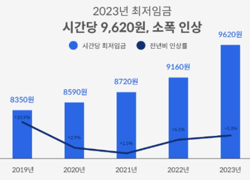 정부는 2023년도 최저임금에 대해 발표를 했습니다. 2022년 9,160원이었던 최저임금을 2023년에는 9,620원으로 작년대비 460원 인상을 하였습니다.