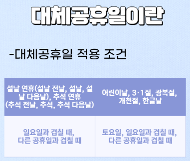 대체공휴일이란 사회적으로 휴일로 공인되는 토요일이나 일요일에 '관공서 공휴일에 관한 규정'이 정한명절 및 국경일, 어린이날과 겹칠 경우에 법령으로 정한 비공휴일에 쉬도록 하는 제도를 가리킵니다. 정확하게 말하면, 설날 연휴나 추석 연휴가 일요일과 겹칠 때만 대체공휴일을 부여받으며, 어린이날, 3.1절, 광복절, 개천절, 한글날의 경우에는 토요일, 일요일과 겹칠때 대체공휴일을 받게 됩니다.