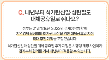 2023년도부터는 크리스마스나 석가탄신일도 지역경제 활성화와 여가권 보장을 위한 대체공휴일 지정 확대 추진 계획에 포함되었으며, 대체공휴일 추가 지정은 시행령 개정 사안이라, 관계부처 협의를 거쳐 2023년도부터 적용할 수 있습니다.
