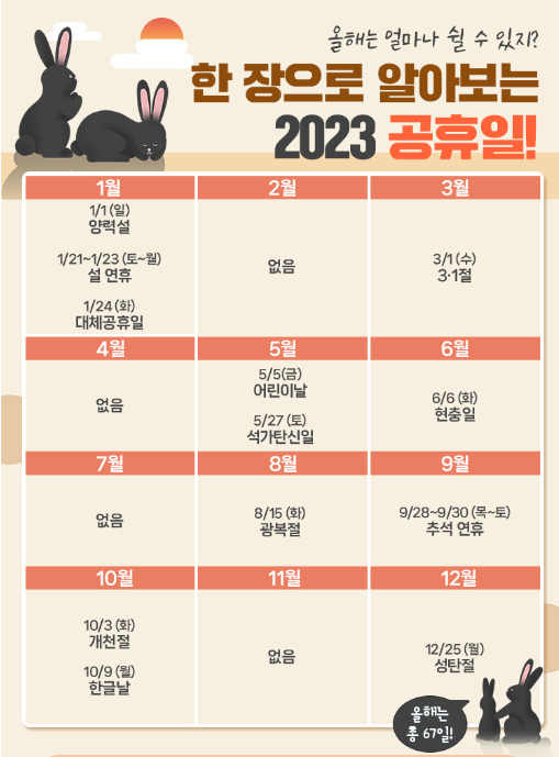 2023년 공휴일이 어느정도 되는지, 그리고 2023년 대체공휴일은 언제 적용되는지 알아봅시다. 또한, 최근 정부가 크리스마스와 석가탄신일을 대체공휴일에 포함하자고 제안했는데, 개정안 심의하고 의결하는 절차만 통과하면 2023년도 공휴일이 모두 완료됩니다.